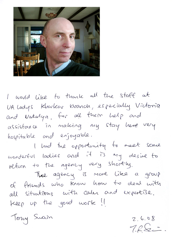 Not really a question, more to give an idea as to the quality of the trip. I wish to say a very big thank you. My trip was a great success, mainly due to the work Oksana put in to making me feel very comfortable and supported. I met a wonderful lady and, whilst it is early days yet, we spend a fabulous 5 days together. I am hoping that I can organise a visit for her to England next year. So, thank you UA Ladies, I would have no hesitation recommending yuor services.