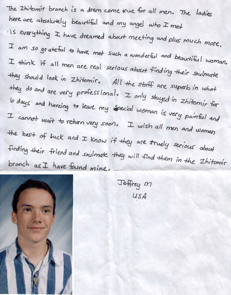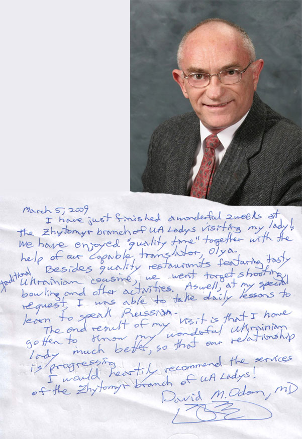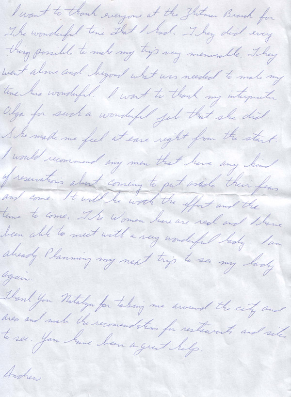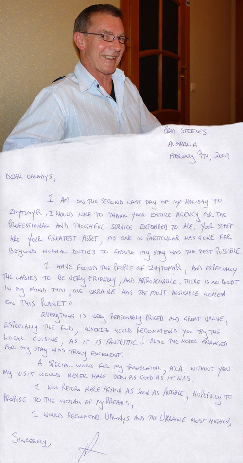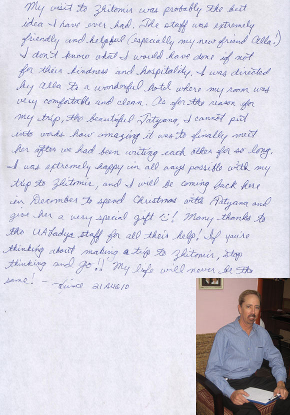 I want to say that UALADYS is a great company. I had a great experience with them. They are not out to scam you, only to help you. The girls are very real! I have been writing to my special lady for a most a year now, we are engaged and have applied for the K-1 Visa, so we can get married. The Ukrainian people are very nice and will help you. I want to thank all the people in the Zhitomir Branch for all the help that I recieved. They really do a wonderful service and make you feel at home in there Country. Once again thank you for a wonderful trip.