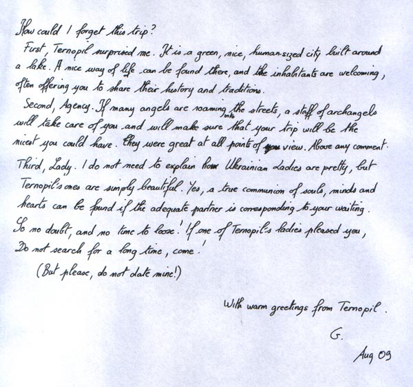 I have visited the Chernigov branch of UA Ladys on 2-3 March 2009, in order to meet with a lady with whom I had been corresponding for nearly 3 months. Everything went well according to the plans and the meeting procedure that had been put in place by the agency. I really met with the lady with whom I had been corresponding. Of course, no agency will ever give you any guarantee as to the success of your relationship. This is common sense. But, as to the objective/mission of the agency, which is to give you an introduction to a real Ukrainian lady, I can say from my experience that it has been fully fulfilled.