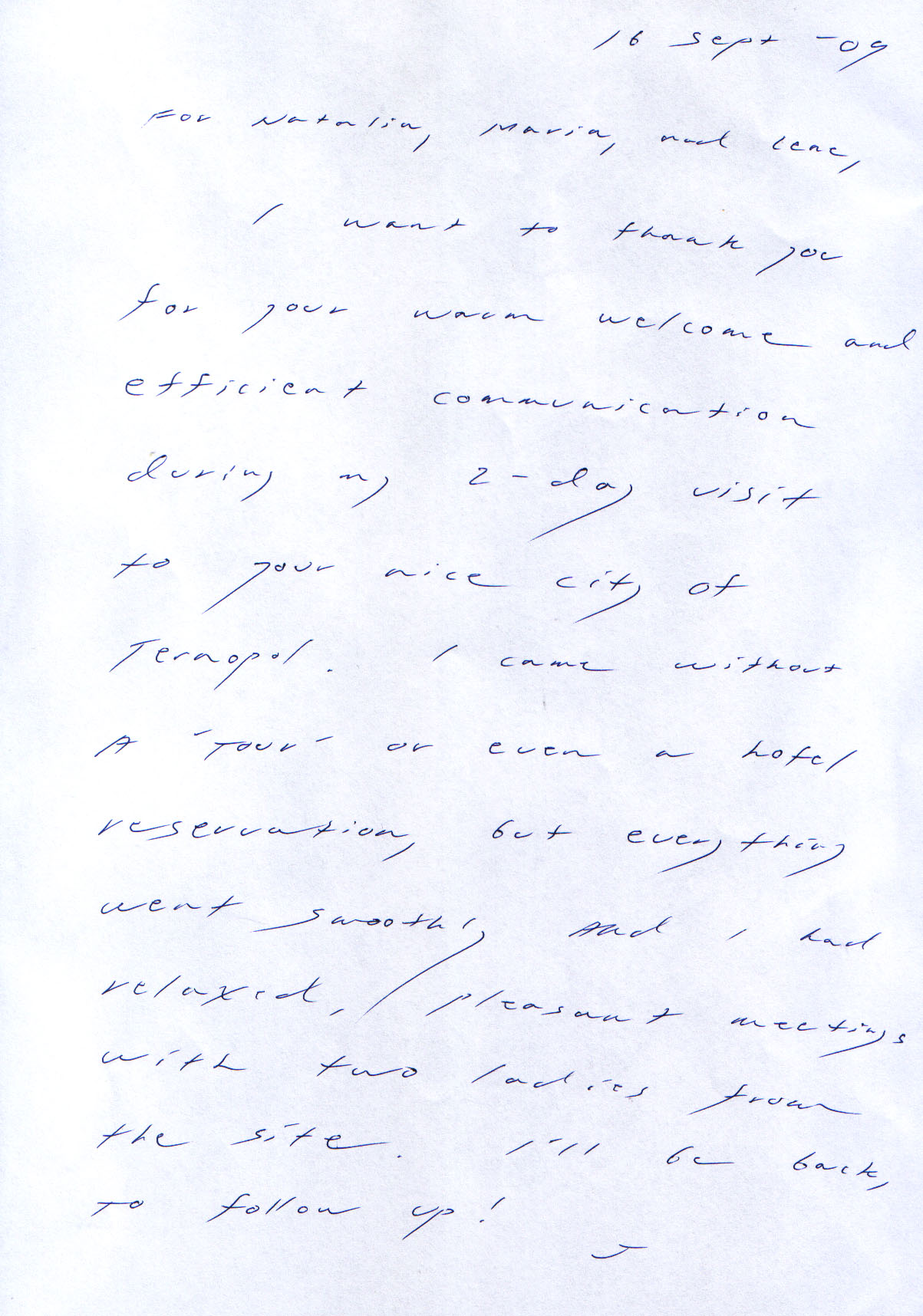 I wanted to thank your staff at the Zhitomir office, through this letter to you, following my recent trip to meet Valyusha. Yuri and Natalya were very kind and helpful to me in spite of the horrors of the Kiev traffic they had to endure on Monday.