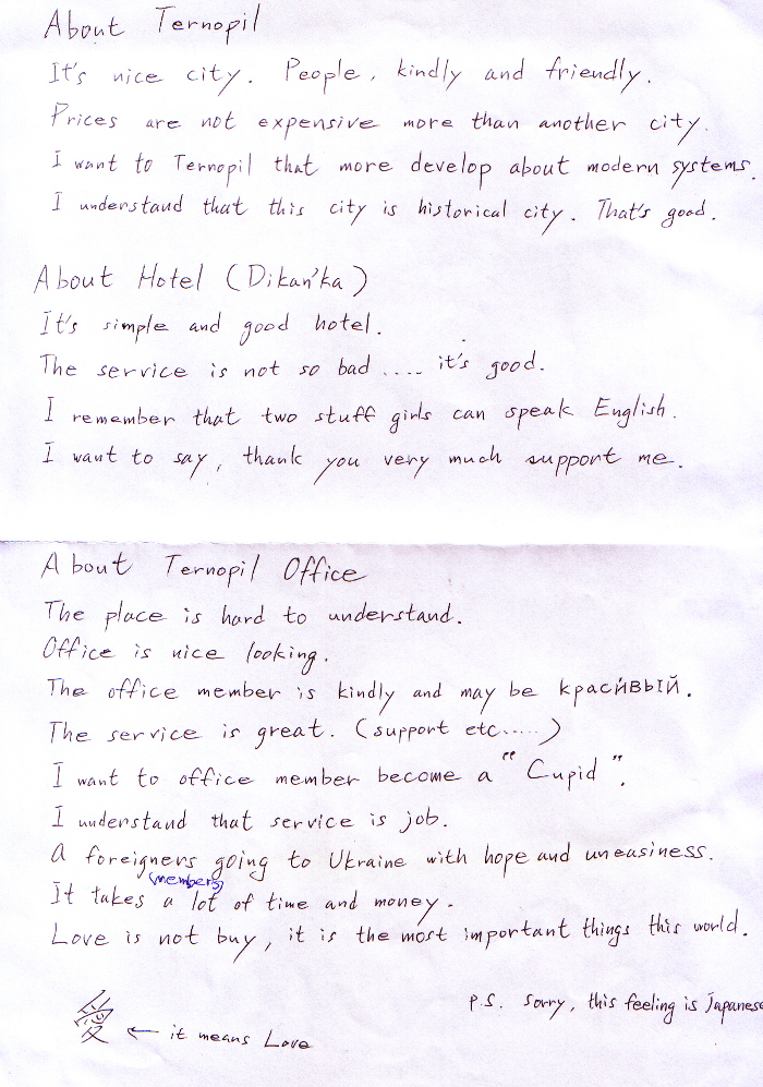 Without question the staff at UA Ladys treated me with respect, thoughtfulness & kindness, from the humble beginnings of trying to arrange my reasonably priced trip right through to the final day, and my return to the UK, for which I will forever thank them, they are without a doubt your greatest asset. I have to say that Kate my interpreter went well beyond her duties, and spent much of her own time with me walking for hours (well it seemed like hours) showing me the sights, and making sure I was fed properly, Thank you very much lovely girl, for any of you younger guys out there if you ever got to meet her Kate would be a keeper, needless to say Kate & I became great friends and will keep in touch with each other. Not to forget Irena & Vica for there great help also, Thank you, and Sergie (forgive the spelling) who showed me very quickly around Odessa before my flight home.