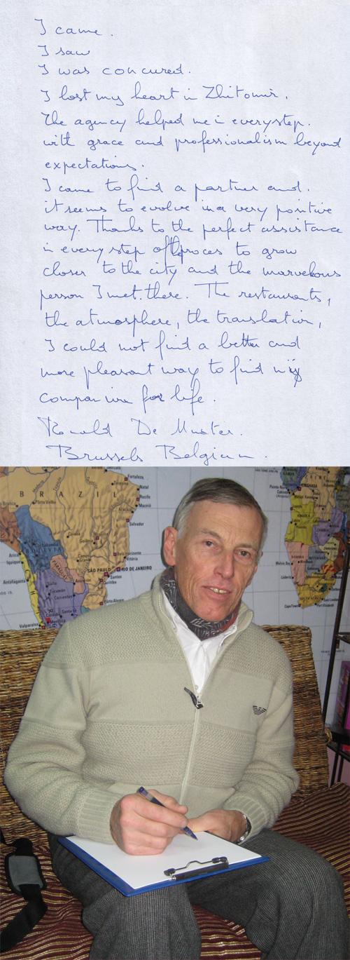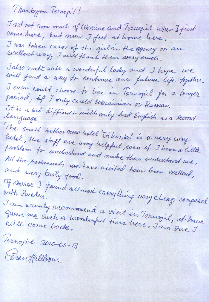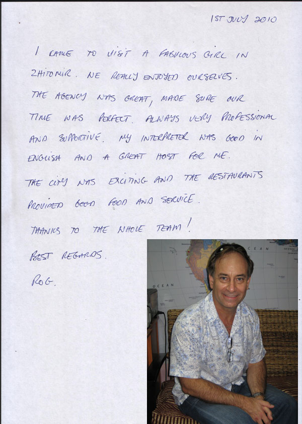 To all members and all who want to be meembers! I have been in Ukraine - Zhitomyr 3 times to visit a lady who has taken my hart... I don't know how this will end yet, but I hope for the best! All my trips have been very nice because of the staff at the office in Zhitomyr.. Every day was a new experience! I have never met such a hospitality anywhere else, and I have been around before... A special thanks to Alina who spend so much of her private time serving me ? unbelievable!!! Thanks to Jura who welcome me to his home New Year!! Thinking of this entire kind people gives me a lump in my troth!! There are no words! Thanks to all who had done this possible for me.. Even if there will be no lady from Ukraine in my life, I will remember for the rest of my life! I have to mention that I am planning to see more of Ukraine, and I am planning to spend my vacation there! It is a fascinating country with much beauty!! I wish you all the best and to find a real Princess from Ukraine (There is only Princesses in Ukraine)!