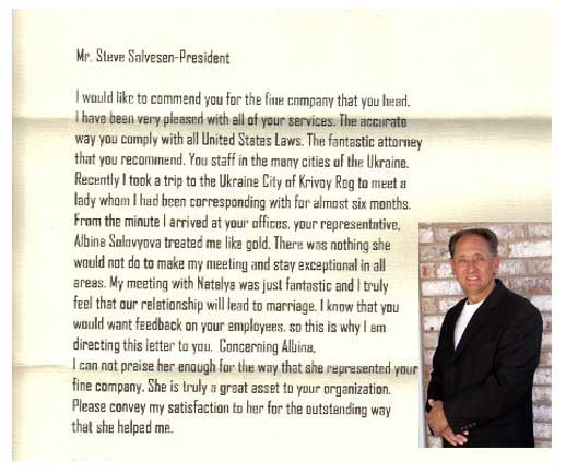 Dear Gentlemen, here we are happy to represent you the Testimonials of the customers who have found their soulmates with the help of the Marriage Making Agency. Here they express their opinion, experience and suggestions for those who are looking for a second half in another country and appreciation to the company and the staff.